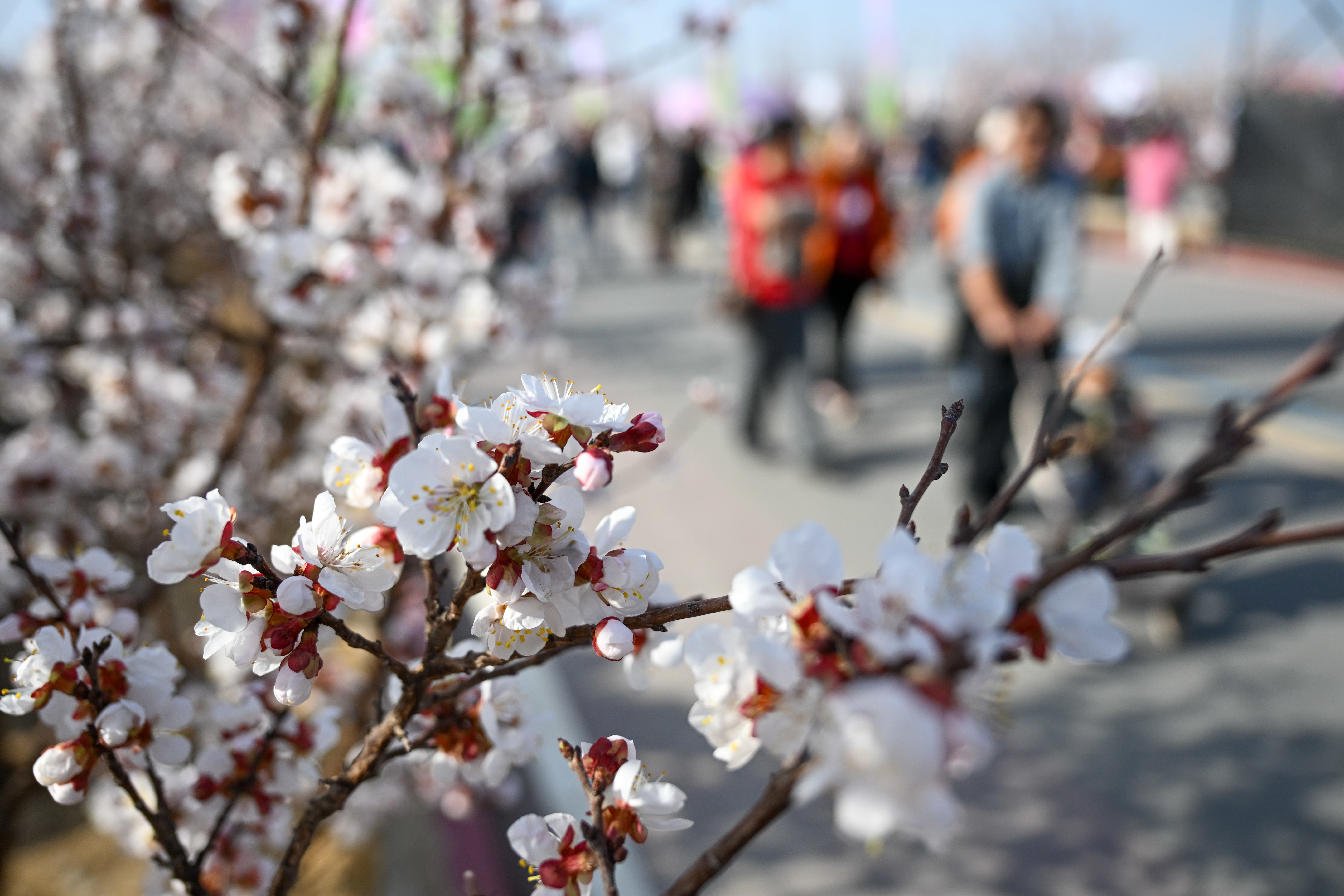 3月20日,在新疆吐鲁番市托克逊县南湖杏花村,旅客和当地住户在杏园赏花。