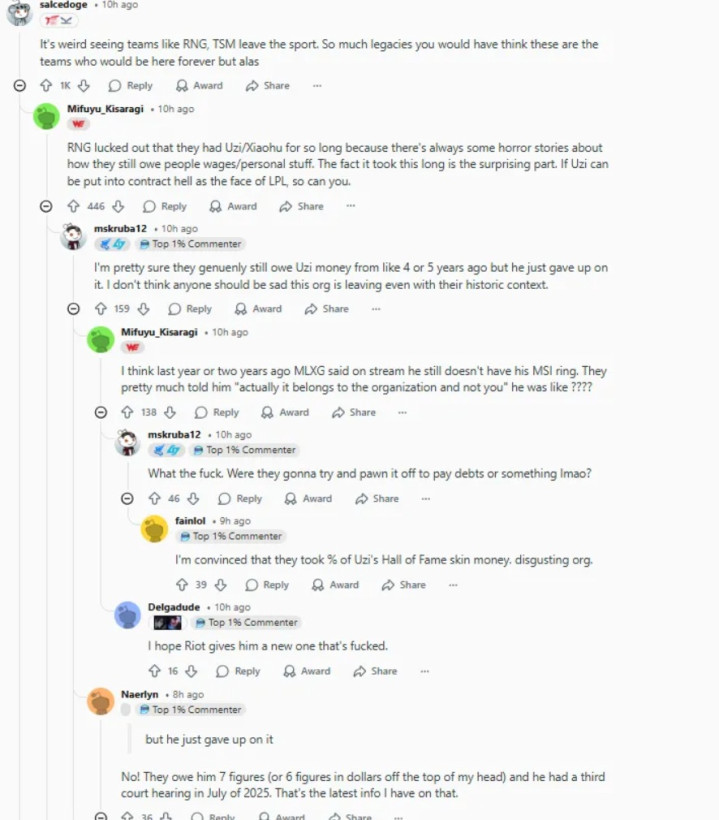 但更多了解信得过情况的网友们开动痛批RNG这支军队,觉得这支军队其实等于LPL赛区的罪东说念主,因为卡公约导致Uzi迟迟不成复出,而且在LPL赛区不错说是恶贯迷漫,场外各式讼事不休,公司的臆想东说念主被列为老赖,场内亦然各式卡选手公约然后欠薪不给。
