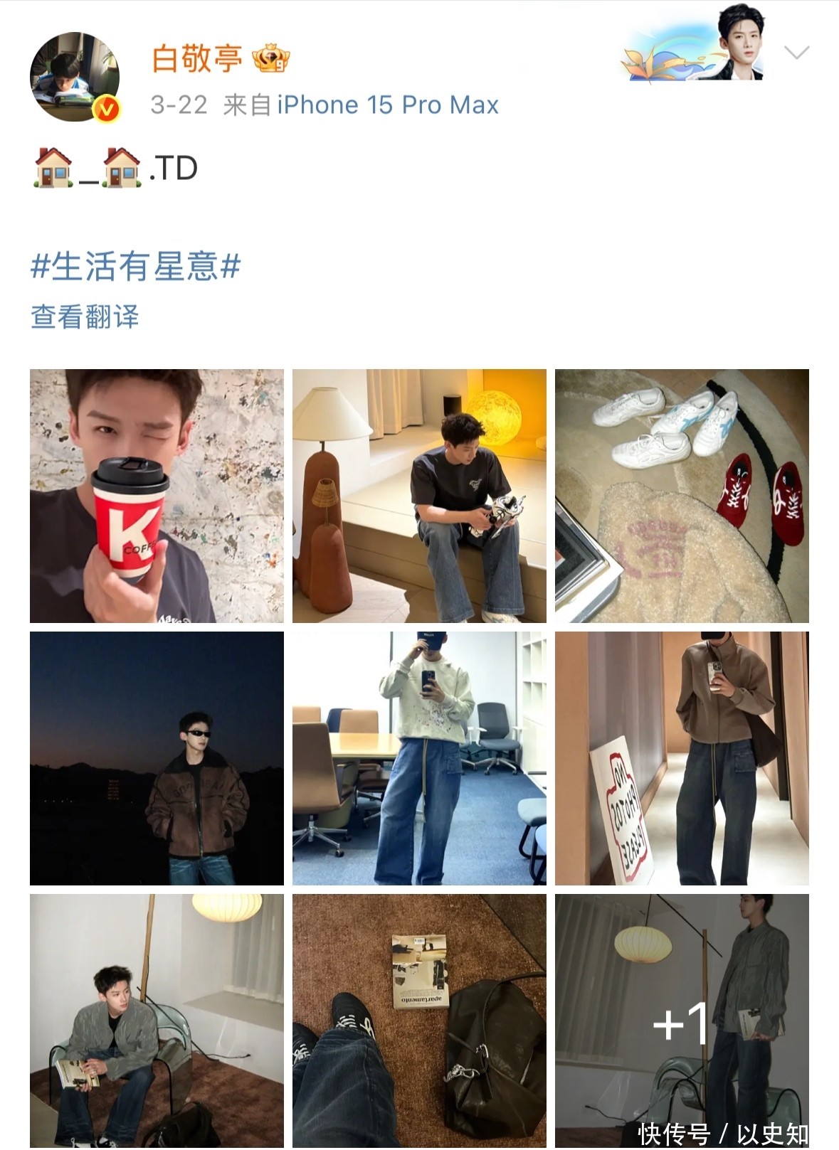 关于生活,他也有特有办法。酬酢平台上他活跃度极高,常共享穿搭像片,幽默答复粉丝留言,被称为“5G冲浪达东说念主”。