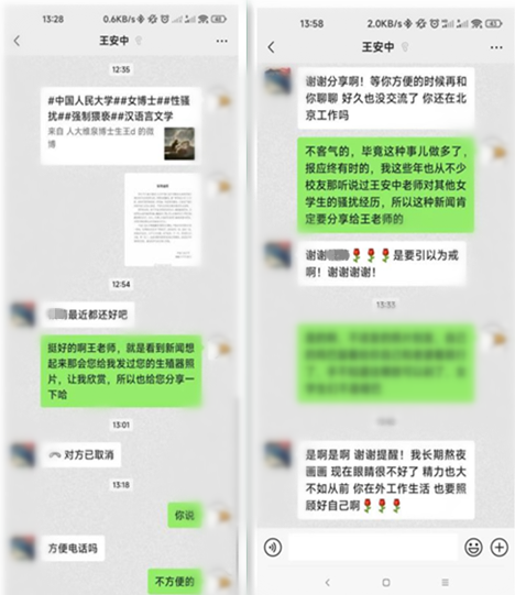 谢佳是在专科研学本领加上了王安中的微信,其时他是小组研学酬金的率领真挚。一启动,聊天内容齐围绕着述业,直到某一天王安中一忽儿在微信上问她一些很秘籍的问题,还几次叫她去办公室。被拒却后,王安中在微信上发来“你今后有点惨了”“对你愈加严格”等话语。